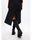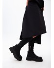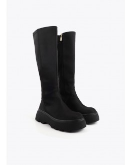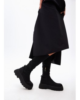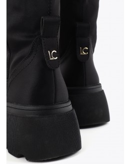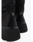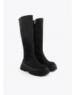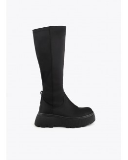 Bota alta con caña tipo calcetín en tejido elástico negro. Suela de plataforma robusta y logotipo metálico en el talón. Cierre lateral con cremallera dorada para un ajuste cómodo. Ideal para un look urbano y moderno.