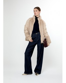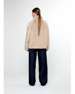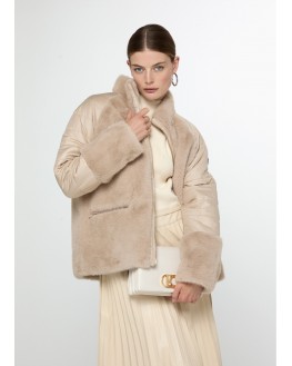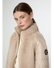 Abrigo elegante con combinación de plumas y pelo sintético. Diseño en negro con cierre frontal de cremallera. Mangas largas acolchadas y detalle de logotipo metálico en el brazo. Forro interior suave para mayor comodidad.